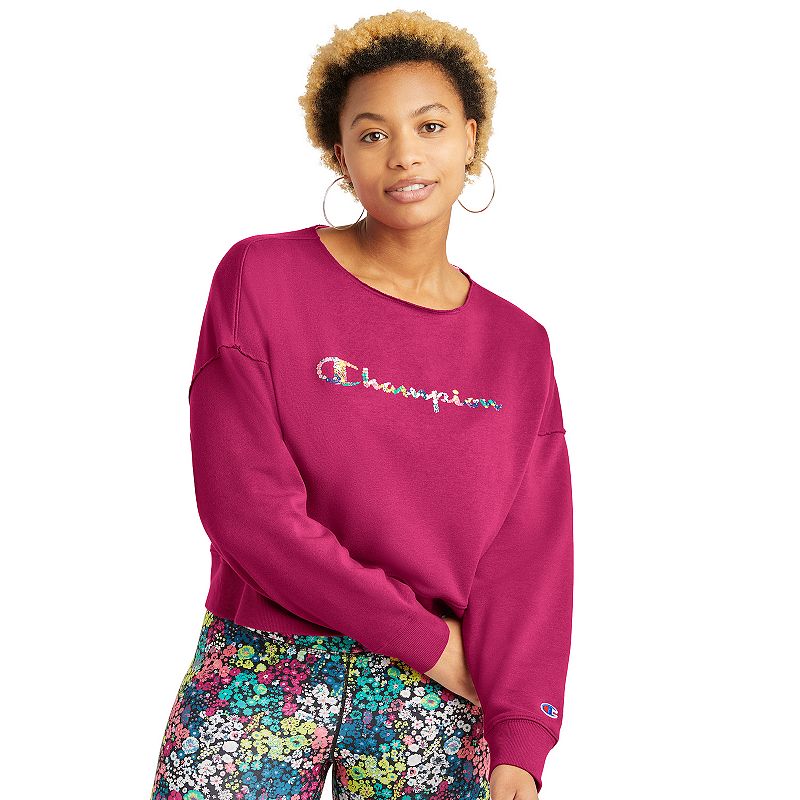 True comfort is yours while wearing this women`s French terry sweatshirt from Champion. True comfort is yours while wearing this women`s French terry sweatshirt from Champion. Comfortable French terry construction Ribbed cuffs and banded hem Iconic `C` patch at left sleeve Raw edge crewneck Long sleevesFIT and SIZING 21 in. approximate length from shoulder to hemFABRIC and CARE Cotton, polyester Machine wash Imported Size Medium. Color Dark Pink. Gender female. Age Group adult.