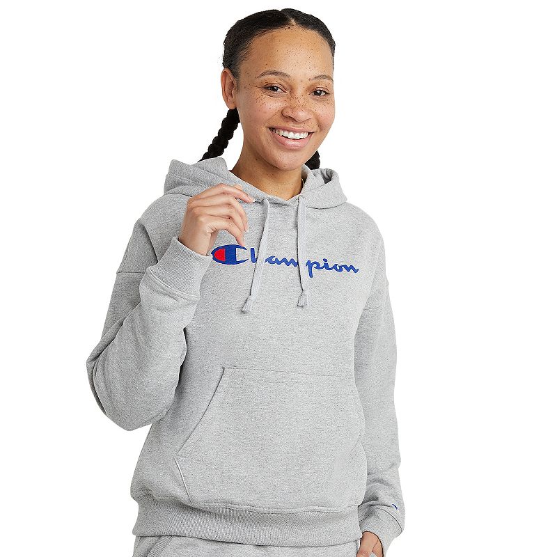True comfort is yours while wearing this women`s graphic fleece hoodie from Champion. True comfort is yours while wearing this women`s graphic fleece hoodie from Champion. Warm and soft fleece construction Reduced shrinking and pilling Front kangaroo pocket Ribbed cuffs and waistband Jersey lined drawstring hood Long sleeves Made with US grown cottonFIT and SIZING 24 34 in. approximate length from shoulder to hem Relaxed fitFABRIC and CARE Polyester, cotton Machine wash Imported Size Medium. Color Dark Grey. Gender female. Age Group adult. Material PolyesterFleeceCotton Blend.