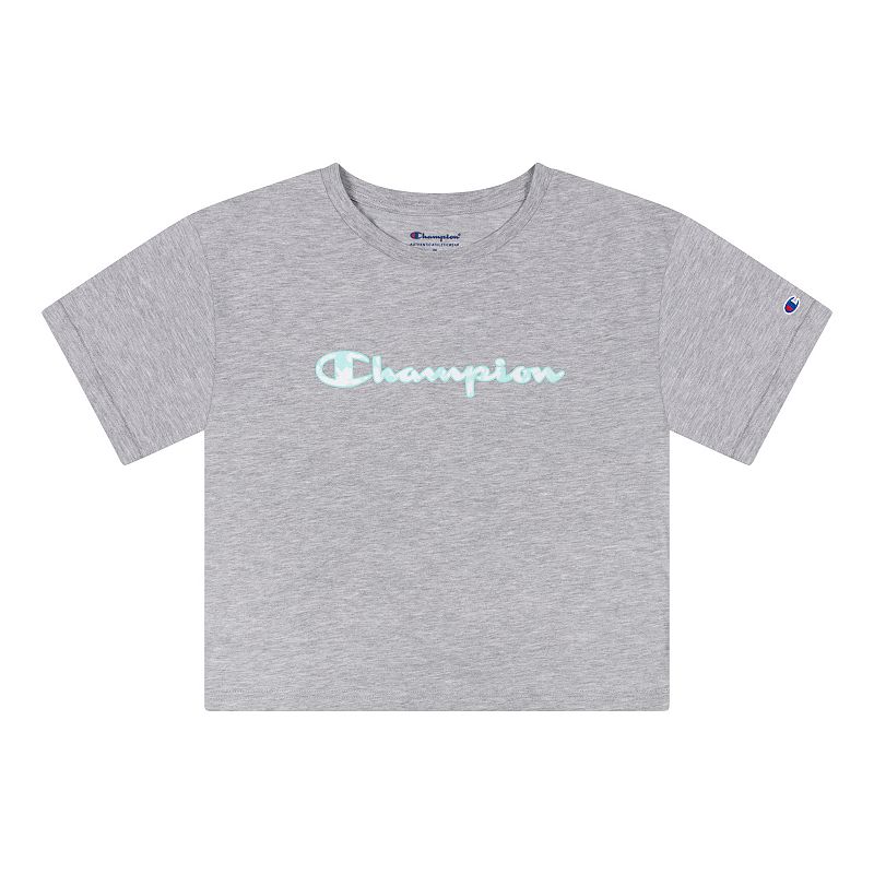 She`ll love the classic style of this girls` Champion logo tee. She`ll love the classic style of this girls` Champion logo tee. Crewneck Short sleevesFIT and SIZING Slim fitFABRIC and CARE Cotton, polyester Machine wash Imported Size Medium. Color Light Grey. Gender female. Age Group kids. Pattern Graphic. Material Cotton Blend.