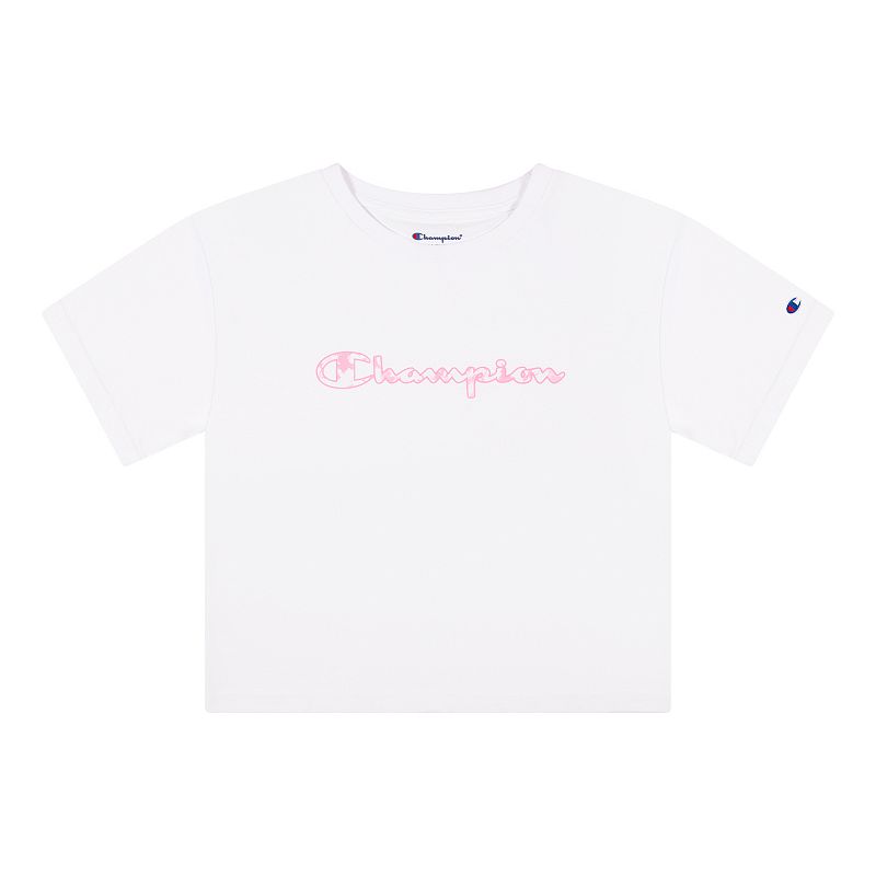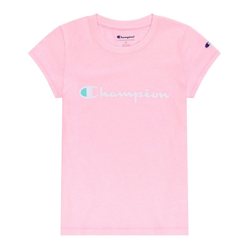 She`ll love the classic style of this girls` Champion logo tee. She`ll love the classic style of this girls` Champion logo tee. Crewneck Short sleevesFIT and SIZING Slim fitFABRIC and CARE Cotton, polyester Machine wash Imported Size Medium. Color Pink. Gender female. Age Group kids. Pattern Graphic. Material Cotton Blend.