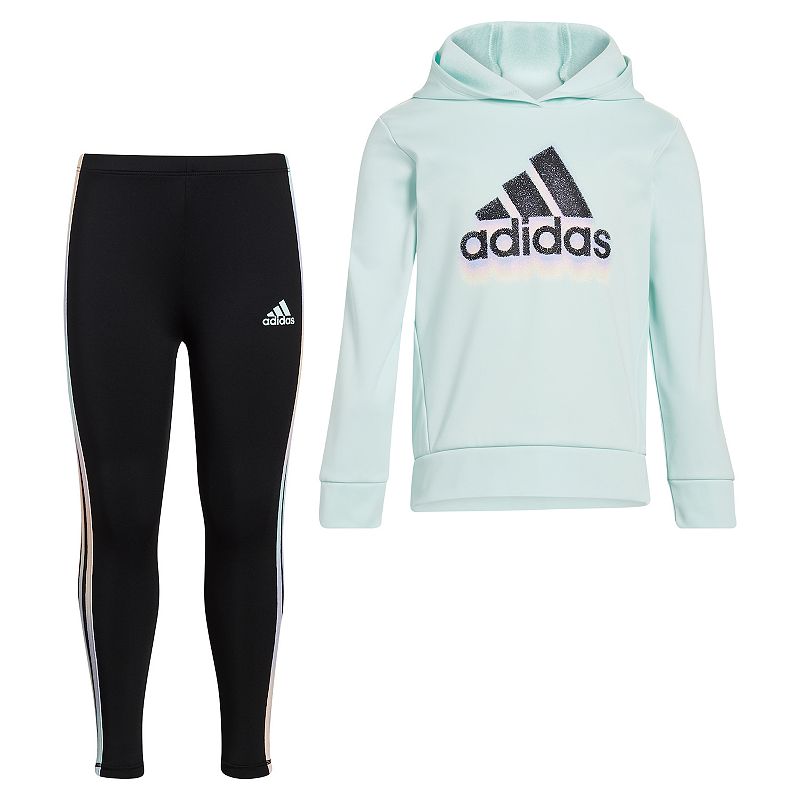 Bring some ombr color to her adidas outfit with this girls` two piece set. Gradient ink details bump up the look of the hoodie and tights. Bring some ombr color to her adidas outfit with this girls` two piece set. Gradient ink details bump up the look of the hoodie and tights. 2 piece set includes hooded top and leggings She`ll feel cozy and warm in the fleece hoodie which pairs up perfectly with the stretchy tights. Both are easy to wash and wear over and over. Attached hood Long sleeves Elastic waistband Ankle LengthFABRIC and CARE Polyester Elastane Machine wash Imported Size 4. Color Lt Green. Gender female. Age Group kids. Pattern Solid.