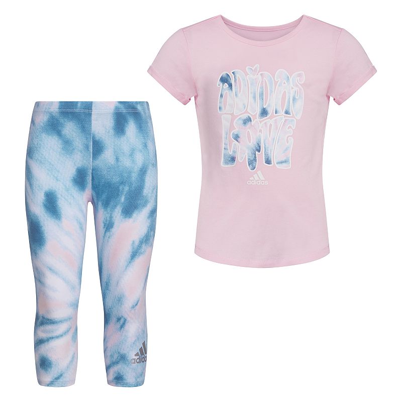 | [PN: 194870988138] [SKU: 72640595] [ UPCorEAN: 194870988138 | Girls 4-6x adidas Graphic Tee & Tie Dye Capri Leggings Set, Girl's, Med Pink With its trendy tie dye leggings and matching graphic tee, this girls` set from adidas is sure to have her feeling cute and put together. With its trendy tie dye leggings and matching graphic tee, this girls` set from adidas is sure to have her feeling cute and put together. 2 piece set includes tee and leggings Tee crewneck, short sleeve, rolled sleeve cuffs, princess seams, graphic on chest, curved hem, tunic length Leggings elastic waistband, metallic adidas brandmark heat transfer on leg, capri length, allover printFABRIC and CARE Tee cotton, polyester Leggings cotton, elastane Imported Machine washFIT and SIZING Relaxed fit Size 4. Color Med Pink. Gender female. Age Group kids. Material Fleece. | FLink DLink | | [4]